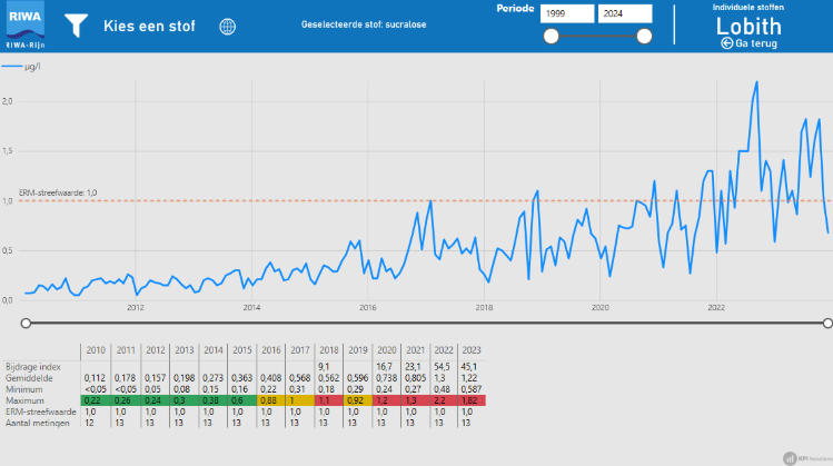 Wilt u bijvoorbeeld zien hoe de concentratie van sucralose zich ontwikkelt? Dit kunt u bekijken via het tabblad ‘lijngrafieken’.