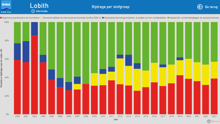 Voor Lobith kunt u zien dat in 2023 de stofgroep ‘Industriële verontreinigingen en consumentenproducten’ de grootste bijdrage aan de index heeft geleverd.