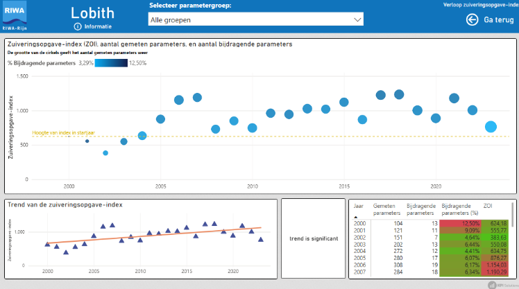 Bij Lobith is een significant stijgende trend te zien. De zuiveringsopgave is dus over de jaren toegenomen in plaats van afgenomen.